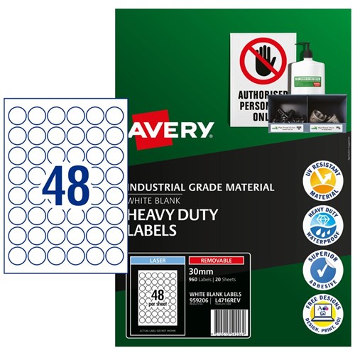 Avery Identification Removable Heavy Duty Laser White L4716 30mm Round 48UP 960 Labels