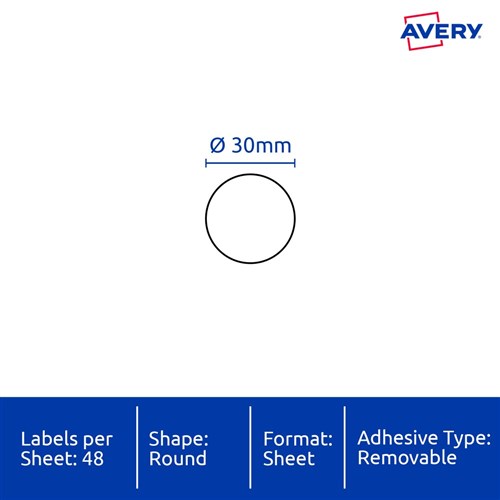 • Size: 30mm diameter 960 labels, 20 sheets. 48 labels per sheet (48UP).