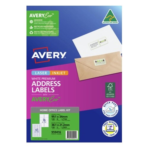 Avery Premium Address Label Kit White Laser Inkjet AveryEco L7162/7651 16/65UP