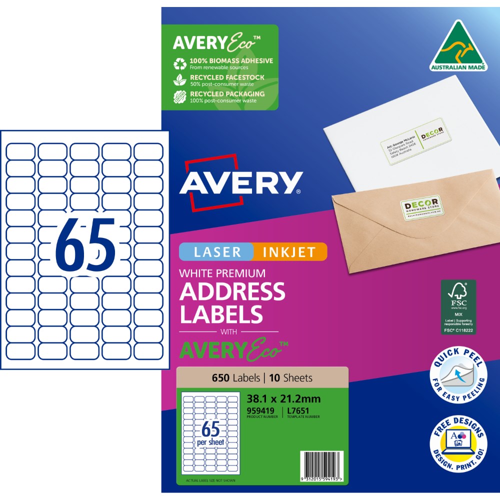 • Size: 38.1x21.2mm 650 labels, 10 Sheets. 65 labels per sheet (65UP).
