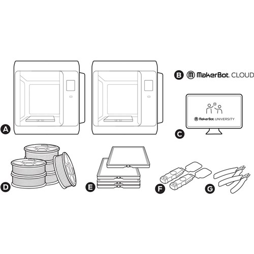 • It includes 2 Sketch printers, 4 spools PLA, 2 starter spool Grey PLA, 4 build plates, 2 teacher and 10 student MakerBot certification program.