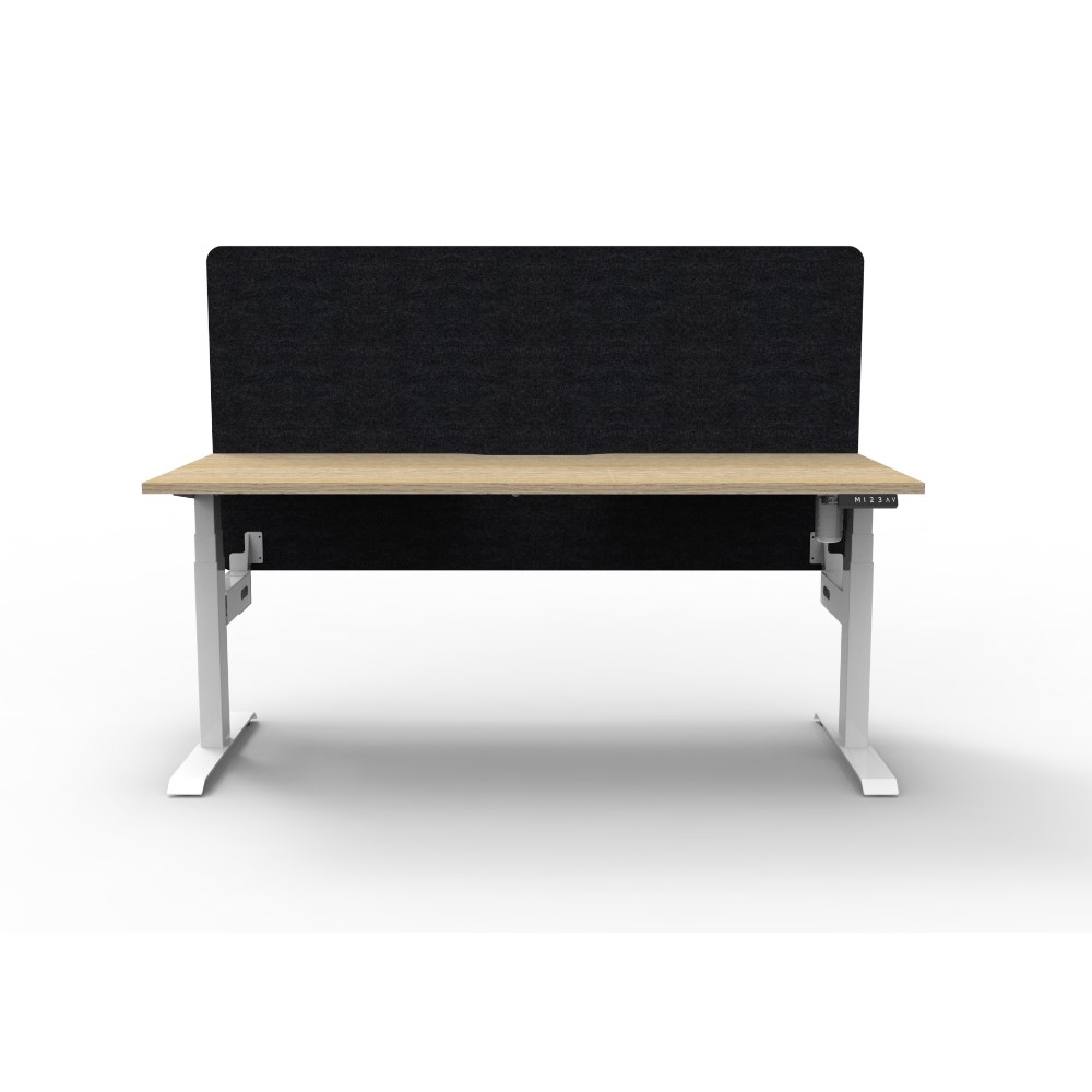 • Electric height adjustable single sided workstation with Natural Oak top and White Satin frame, Black Eco screen.