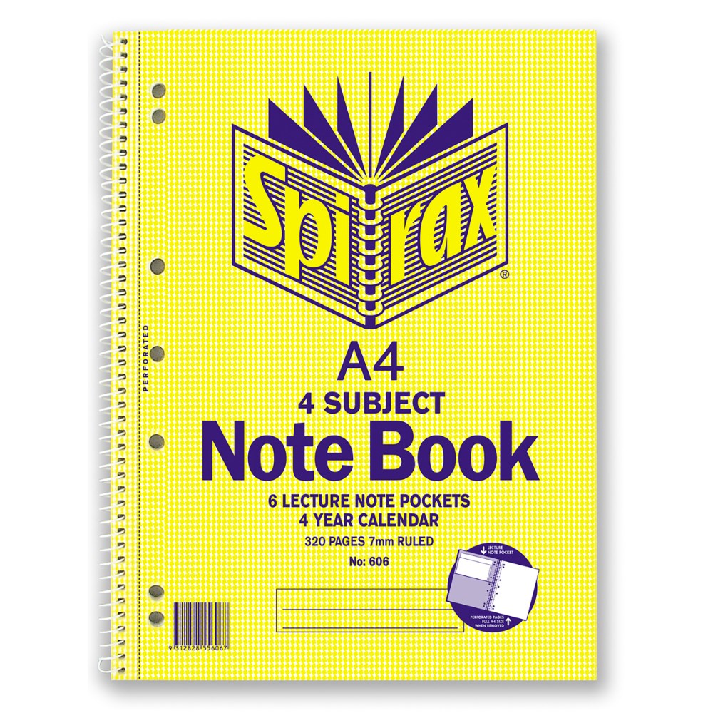 Spirax 606 4 Subject Notebook Perforated/Note Pockets A4 Ruled 320 Page Side Opening