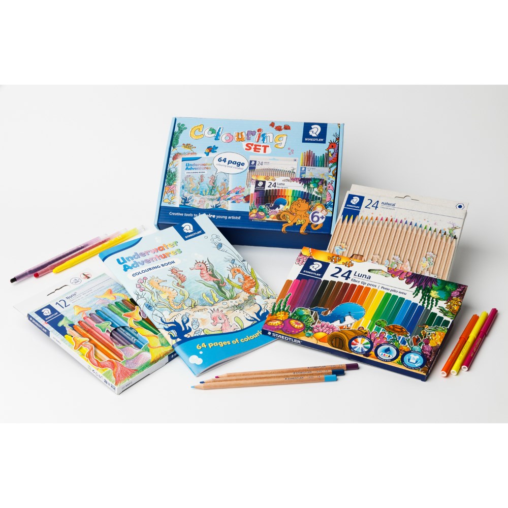 • Includes 64 page colouring book, 24 Natural Coloured Hexagonal Pencils, 12 Noris Wax Twister Crayons and 24 Luna Fibre-Tip Pens.